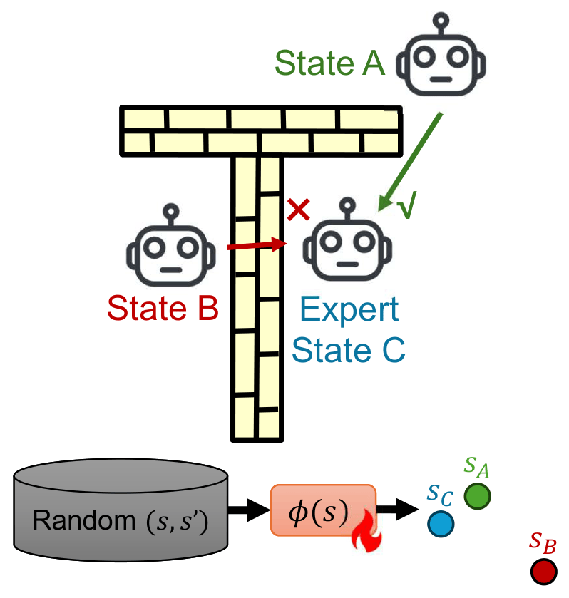 - Pre-training stage: We leverage a small (1% of online rollouts) number of unstructured, low-quality (e.g., random) state-only data to train an Intention-Conditioned Value Function [2]. The resulting embedding captures a rich, dynamics-aware notion of reachability between states.
