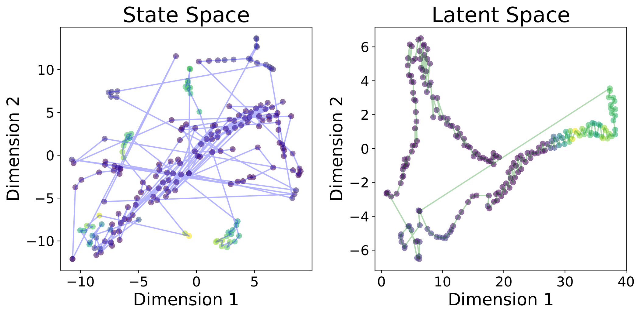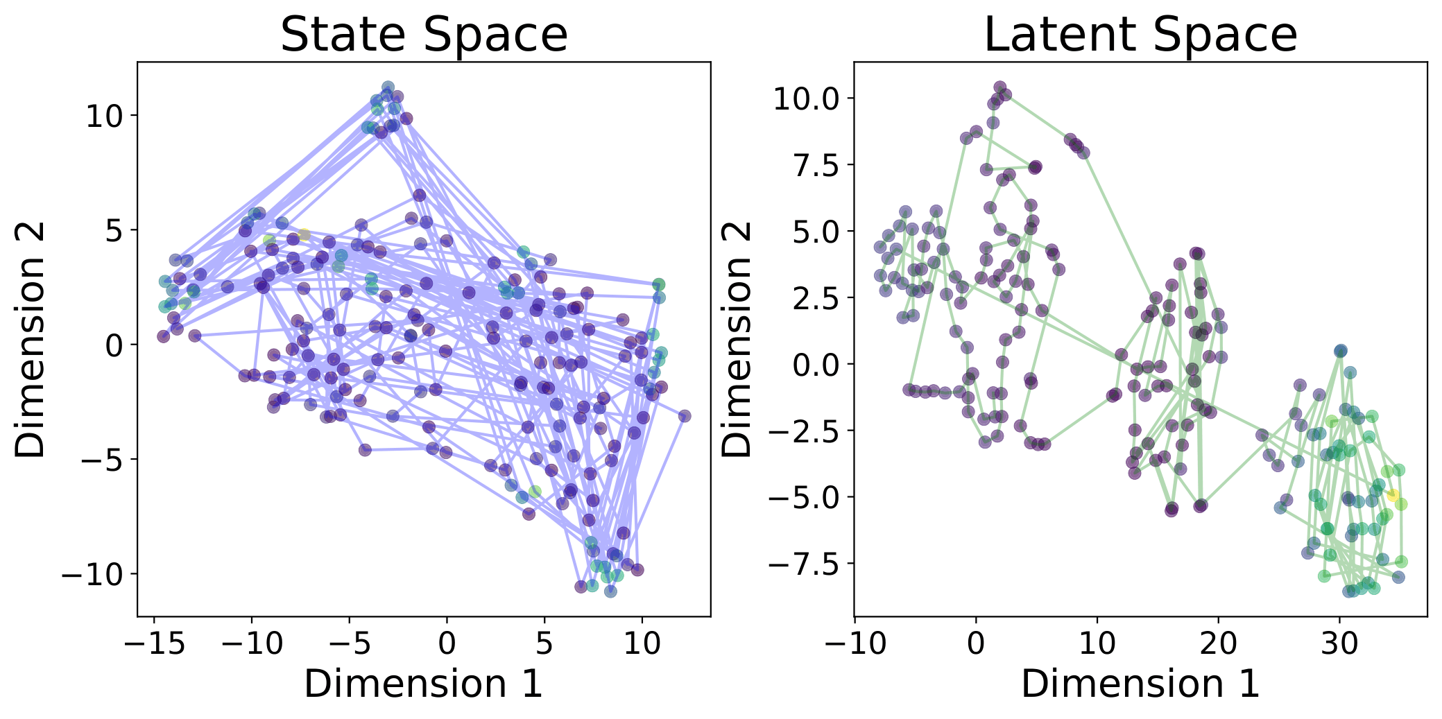 t-SNE visualizations in the original state space and the embedding latent space on HalfCheetah and Walker2d. The color of the points represents the ground-truth reward of the state (greener is higher). States connected by lines are adjacent in the trajectory. The ICVF-trained embedding provides a more dynamics-aware metric.
